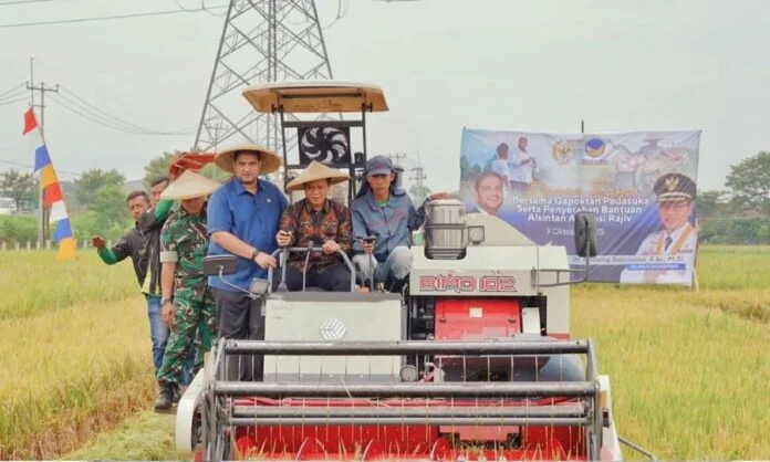 Pada kesempatan panen raya itu, Rajiv turut menyerahkan bantuan berupa alat mesin pertanian (alsintan) dan benih padi untuk 55 kelompok tani, yang akan digunakan menggarap lahan seluas 400 hektare