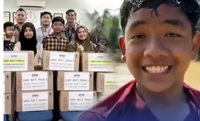 Dalam unggahan yang viral, terlihat sari roti menggandeng salah satu bocah yang ada di video sebagai simbolis memberi bantuan roti.